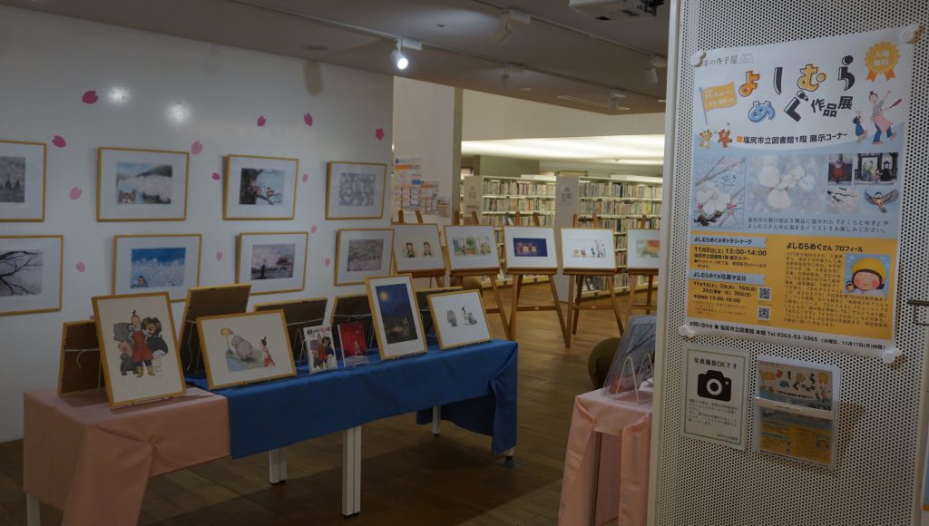 塩尻市在住の絵本作家よしむらめぐさんの作品展を開催します。塩尻市の贄川を舞台に描かれた『さくらとゆき』や心温まるイラストの作品を間近でご覧ください。