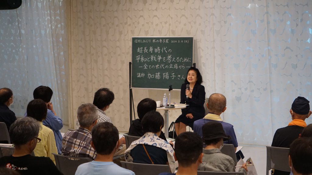 まず、今回の講演の演題「超長寿時代の平和と戦争を考えるためにー全ての世代の立場からー」に込めた思いとして、高度成長期の日本では60歳で定年し、後は余生と考えるのが一般的でしたが、現在は60歳を迎えた後も20年30年生きていかなければならない時代になっています。行政によるケアや社会制度は、高齢者のためだけではなく、介護で家族が崩壊しないために若い世代にこそ必要ですと話され、これからの社会と社会制度を構築していくために、今こそすべての世代が過去の戦争や平和について知り、考えることが大切だと話されました。