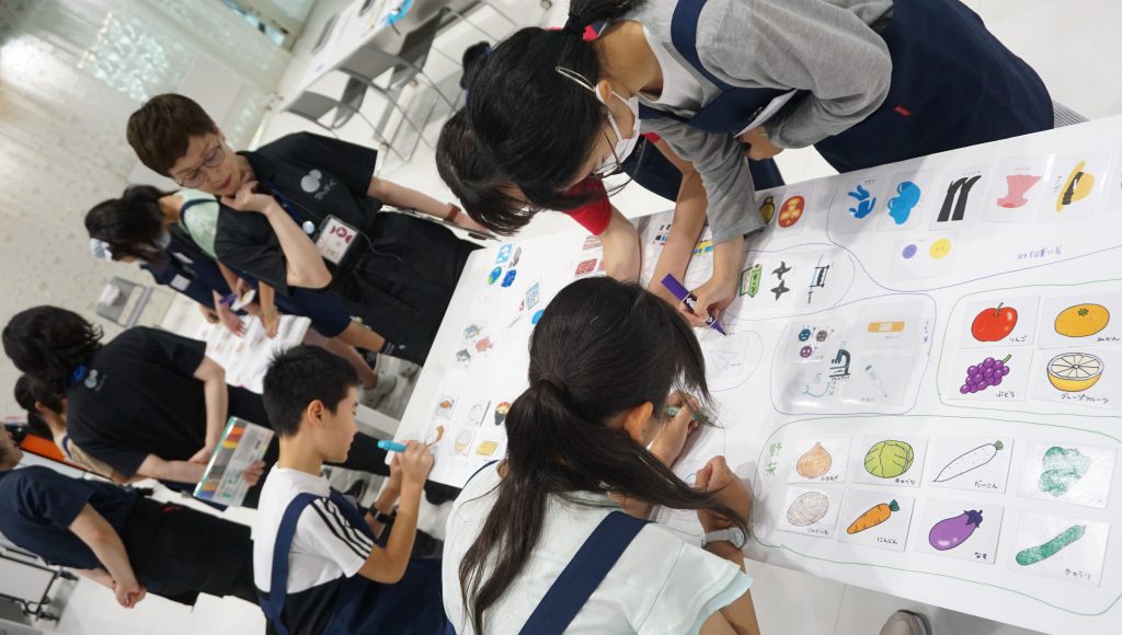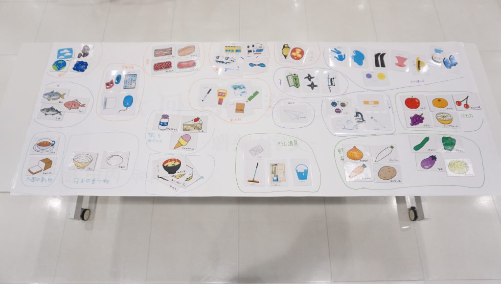 イラストの描かれたカードを分類するワークでは、どんな分け方をするか2チームにわかれて話し合いました。