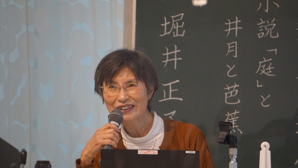 9/26(日)、信越放送ラジオでレギュラーを務め、エッセイの執筆も行っている堀井正子さんの講演会を開催しました。堀井さんは塩尻市宗賀の洗馬宿に焦点を当て、芥川龍之介が書いた「庭」と洗馬宿との深い関わりについてお話してくださいました。