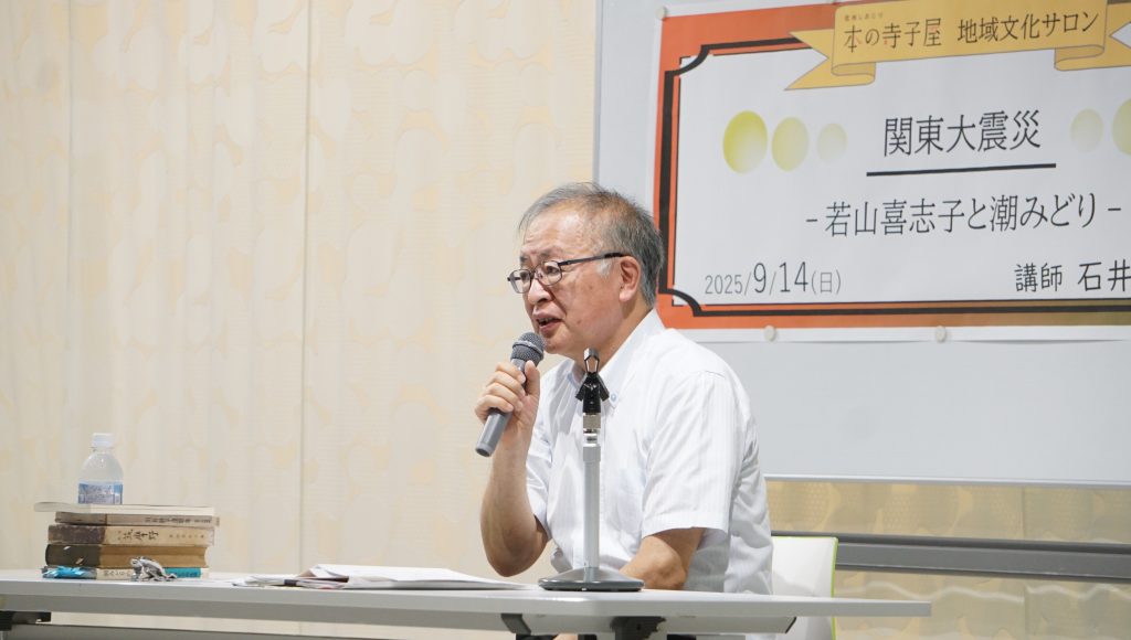 9月14日(日)に東京学芸大学名誉教授の石井正己さんの講演会を開催しました。1923年に関東大震災が起きたとき、塩尻出身の喜志子・みどりの姉妹が大災害と向き合った様子をお話ししていただきました。